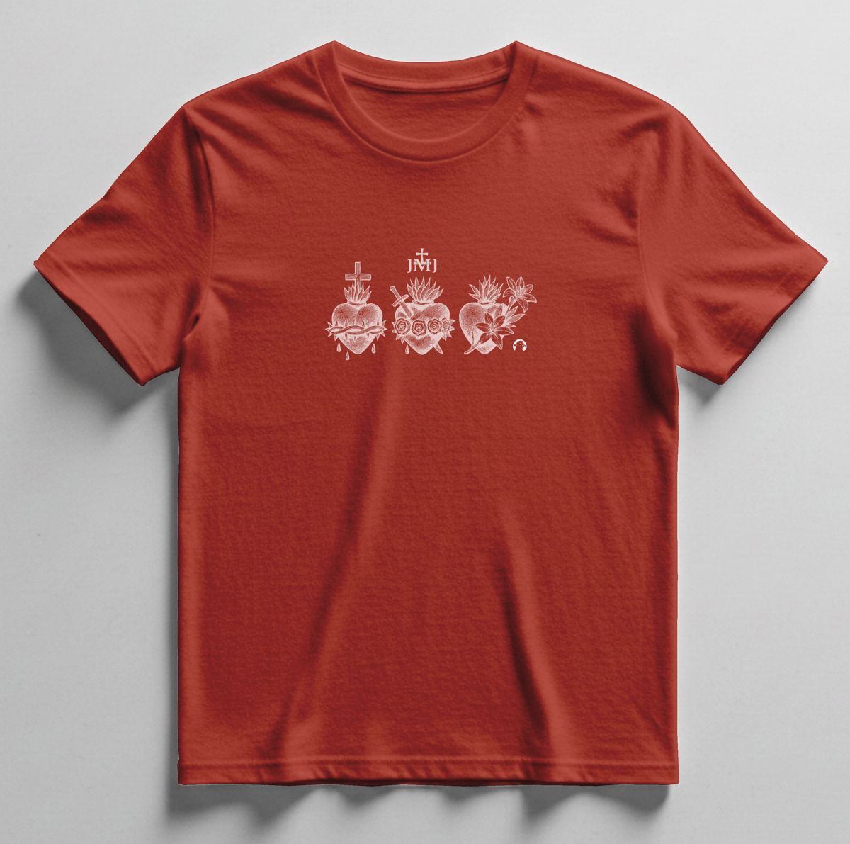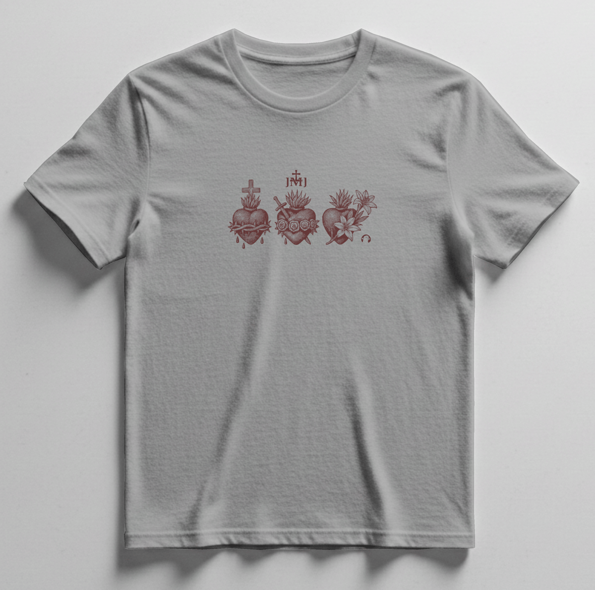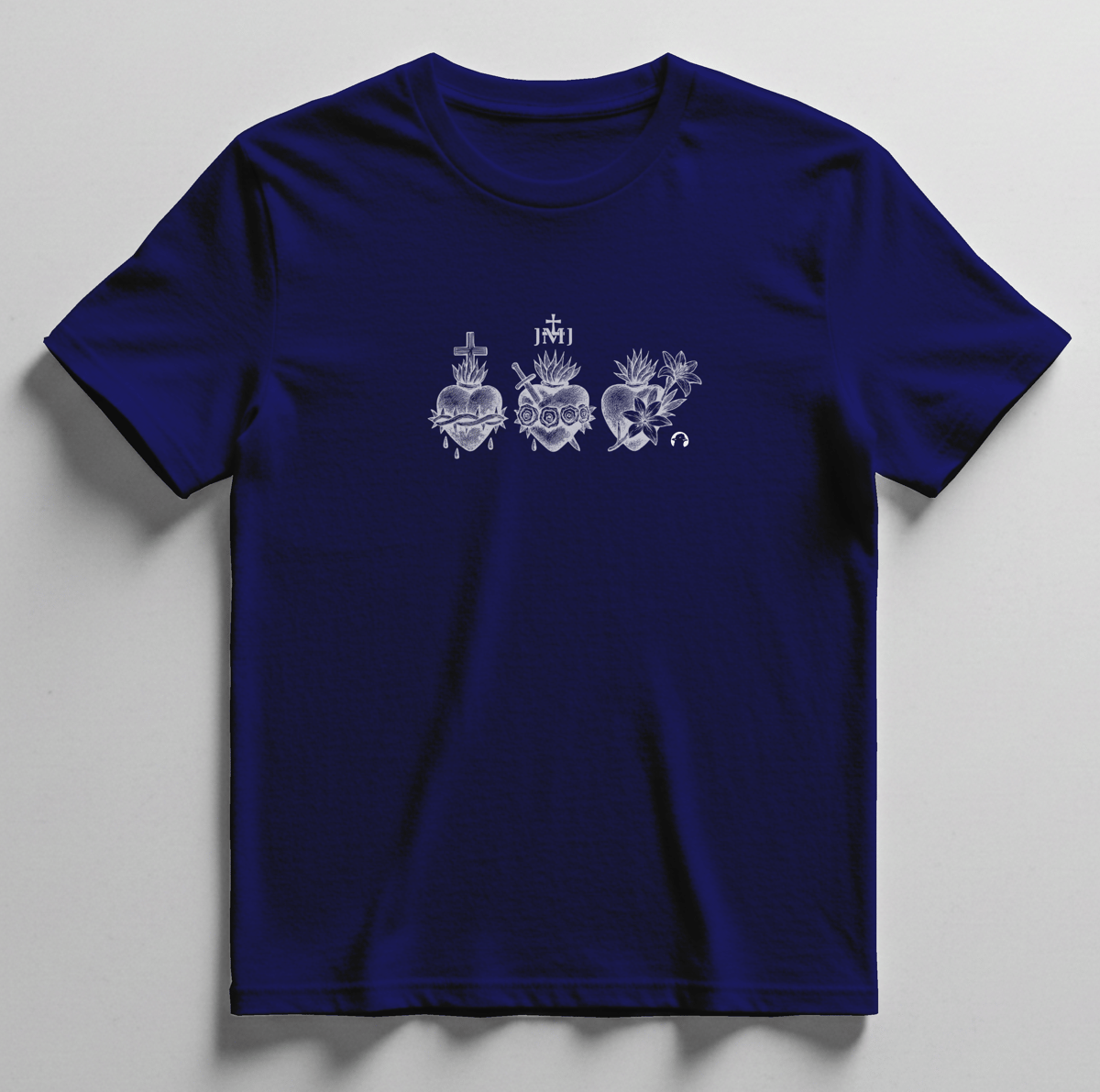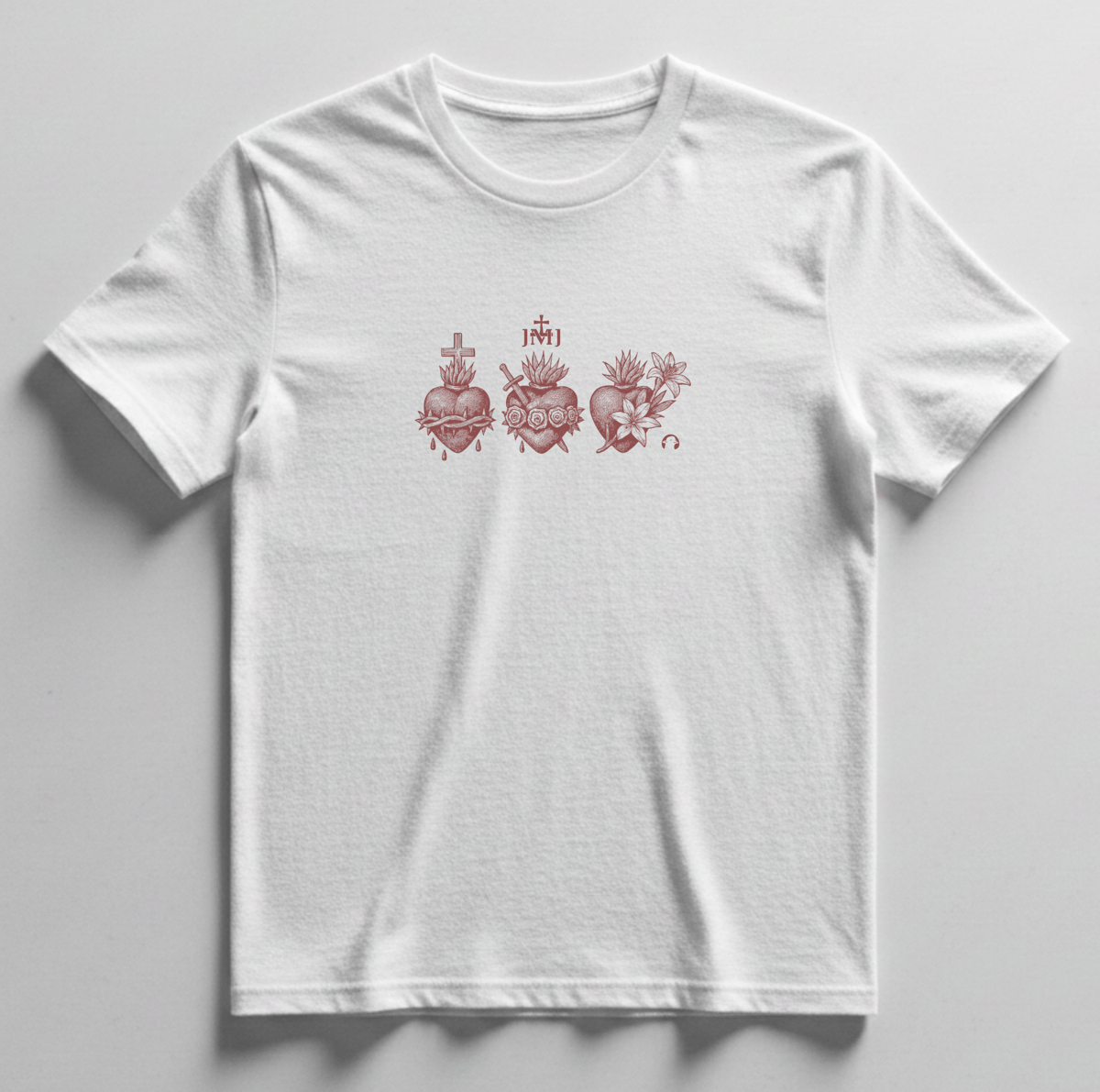 A estampa central no peito traz o símbolo JMJ, acompanhado dos três Corações da Sagrada Família, representando São José, Maria e Jesus. Uma arte que expressa fé, união e devoção, inspirada nos valores da família cristã.