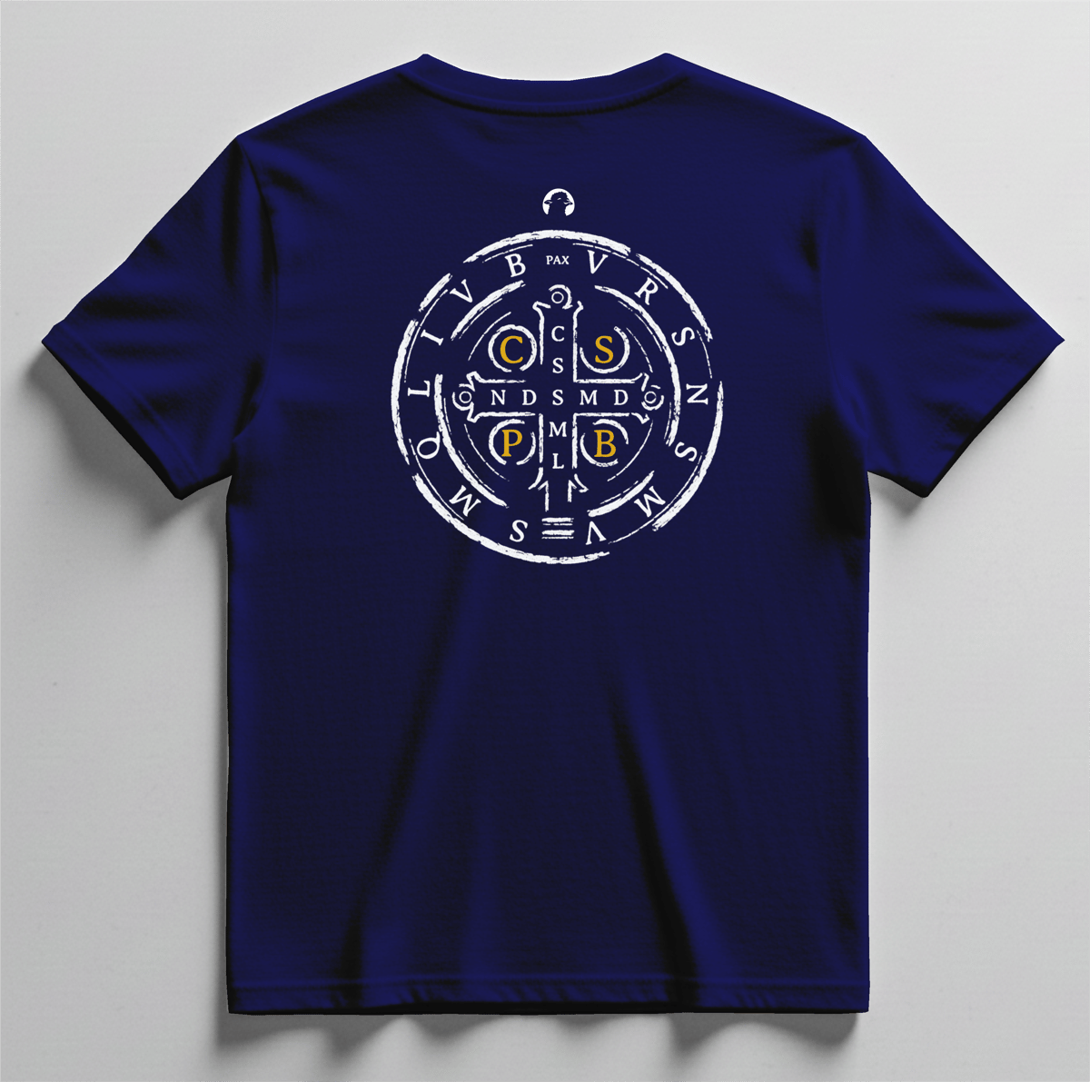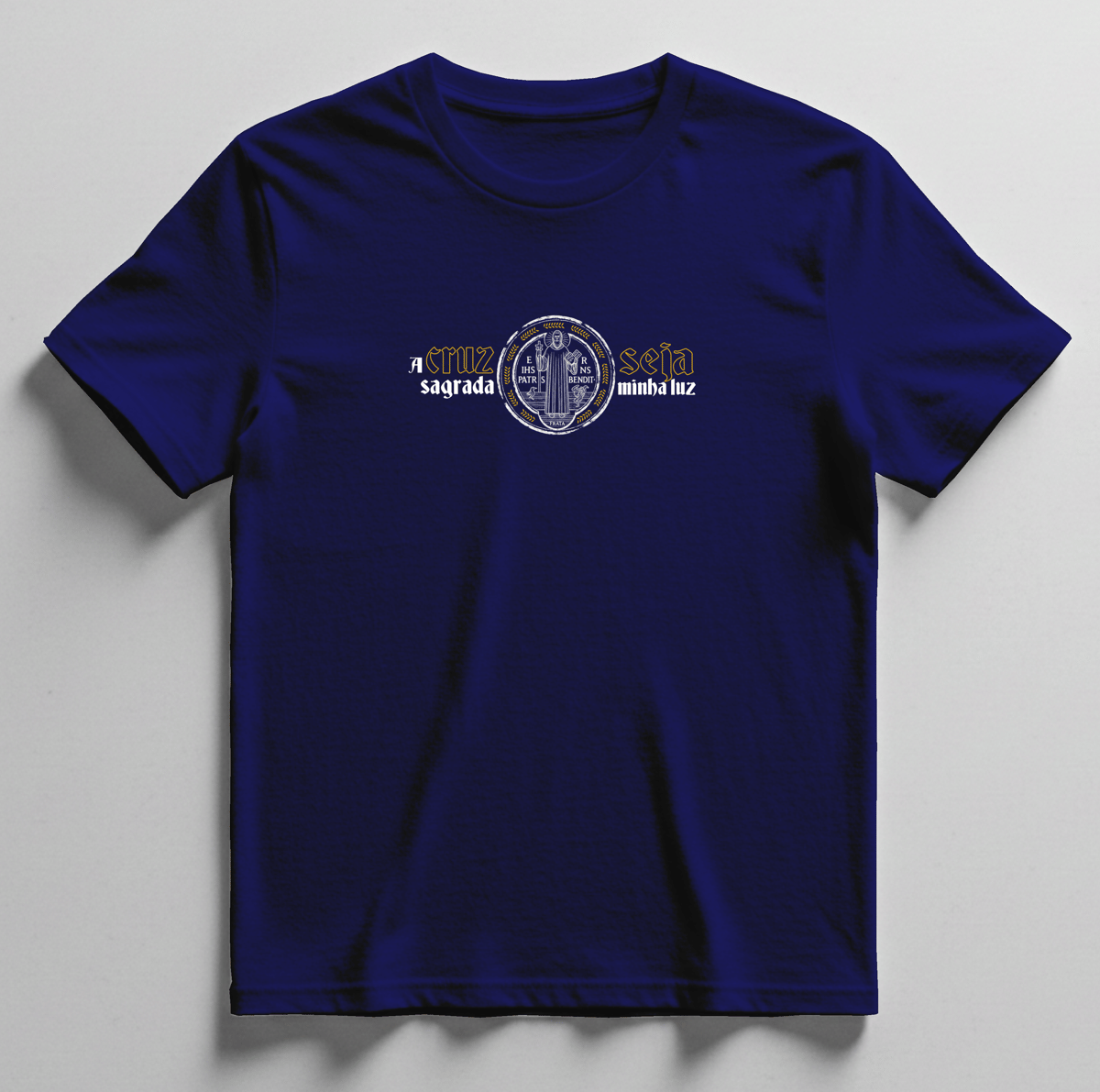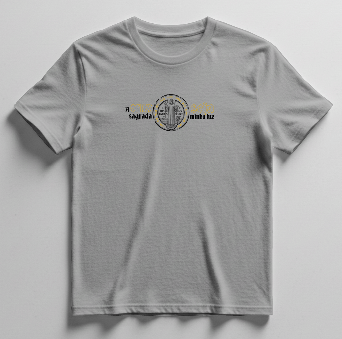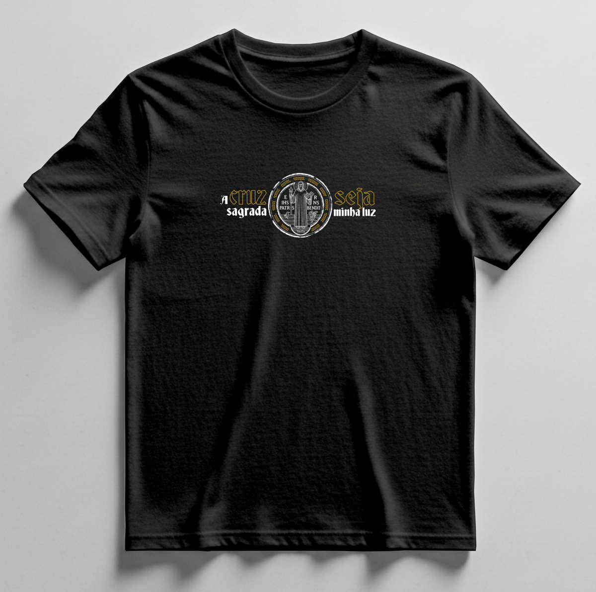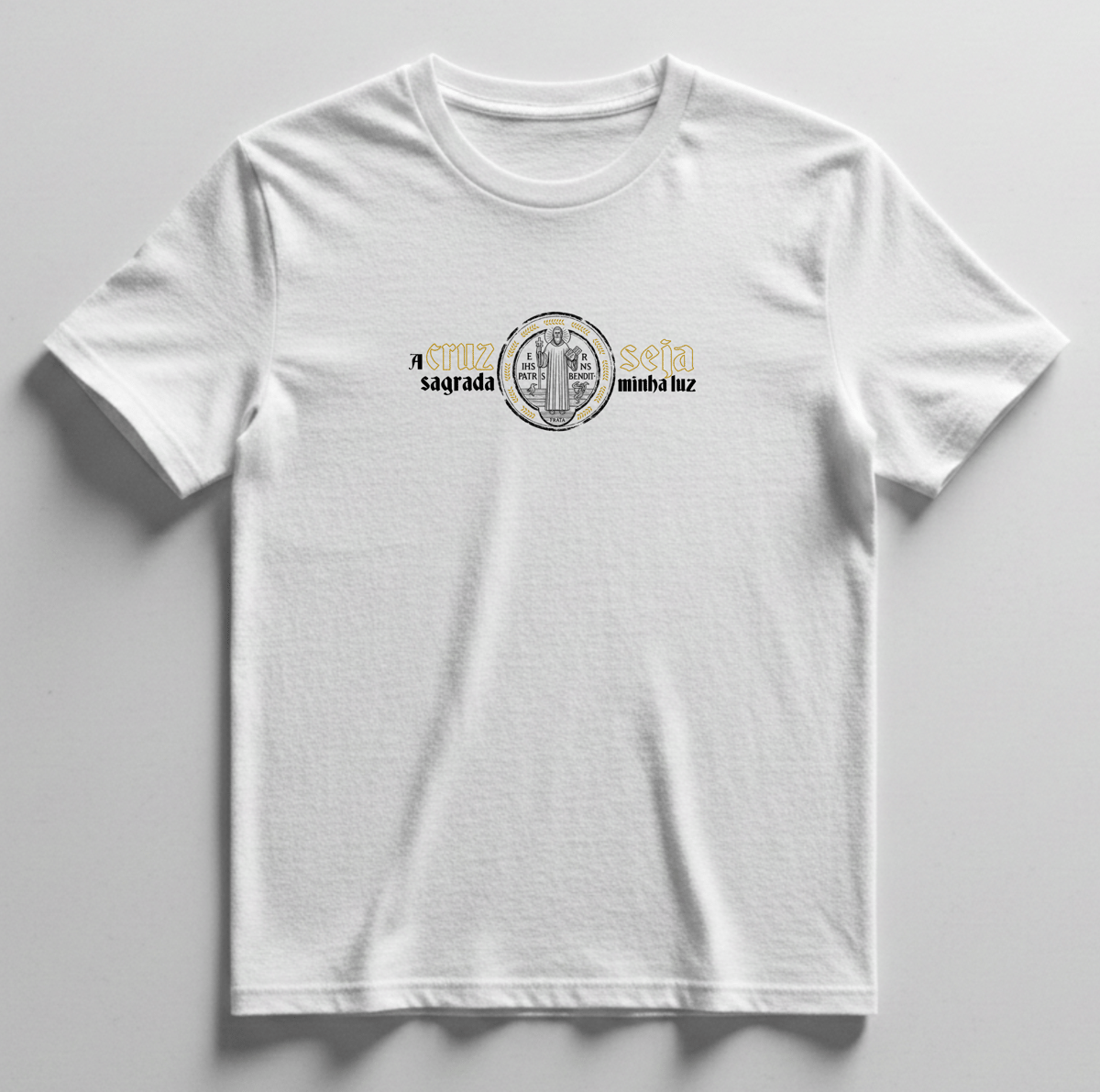 Na parte frontal, a camiseta apresenta a Medalha de São Bento com a imagem do santo, acompanhada da inscrição