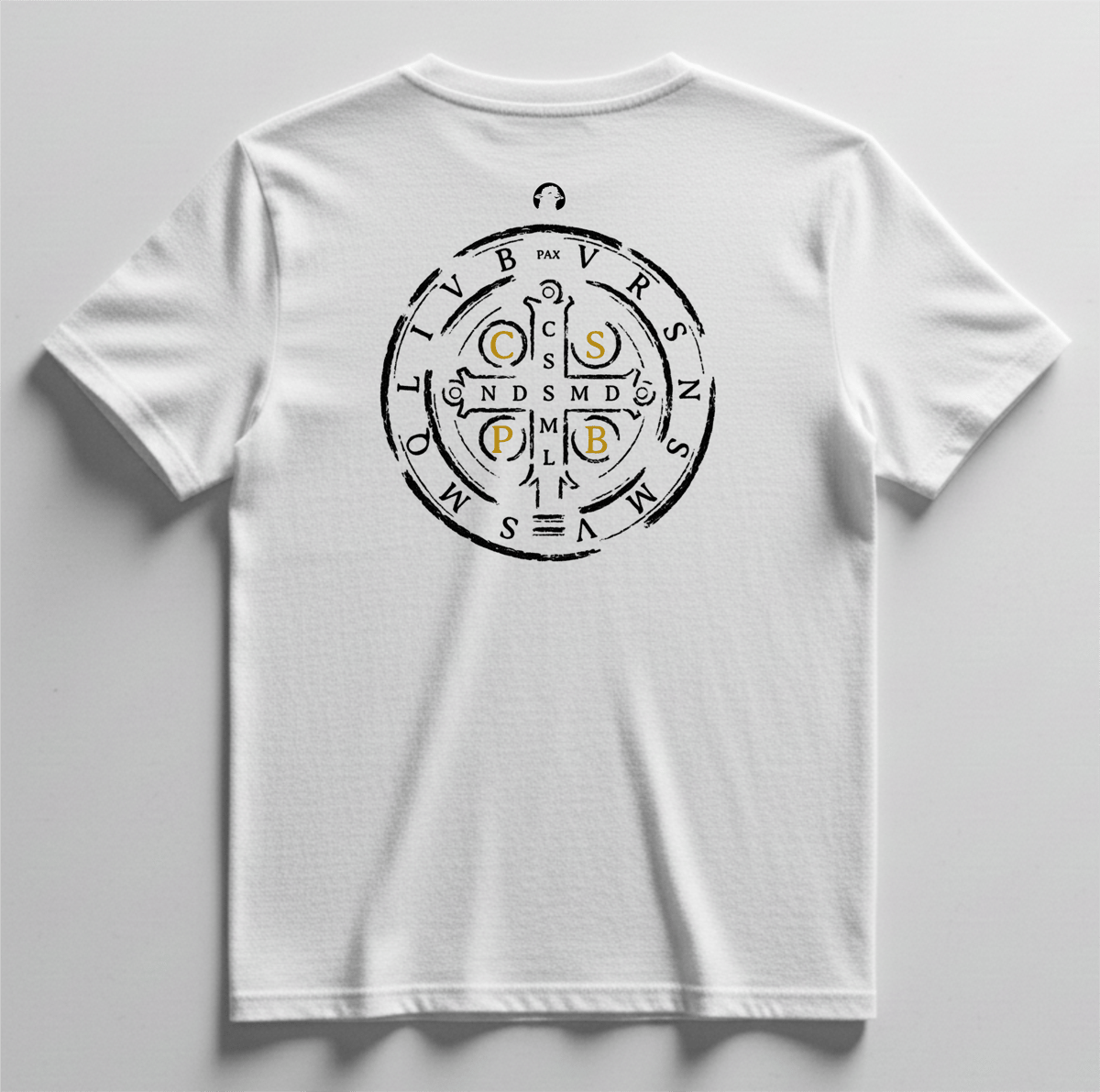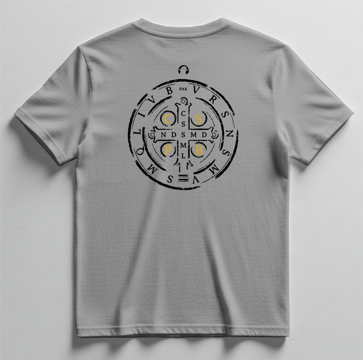 Nas costas, a estampa traz a Medalha de São Bento em tamanho maior, com o lado das letras, símbolo tradicional de fé, proteção e combate espiritual.