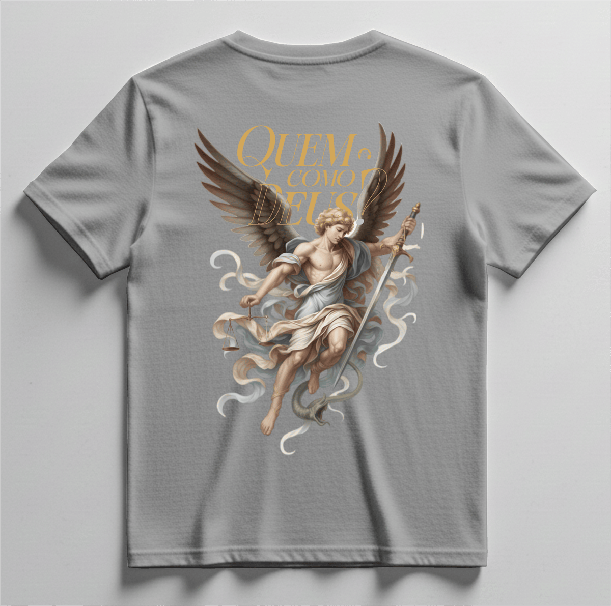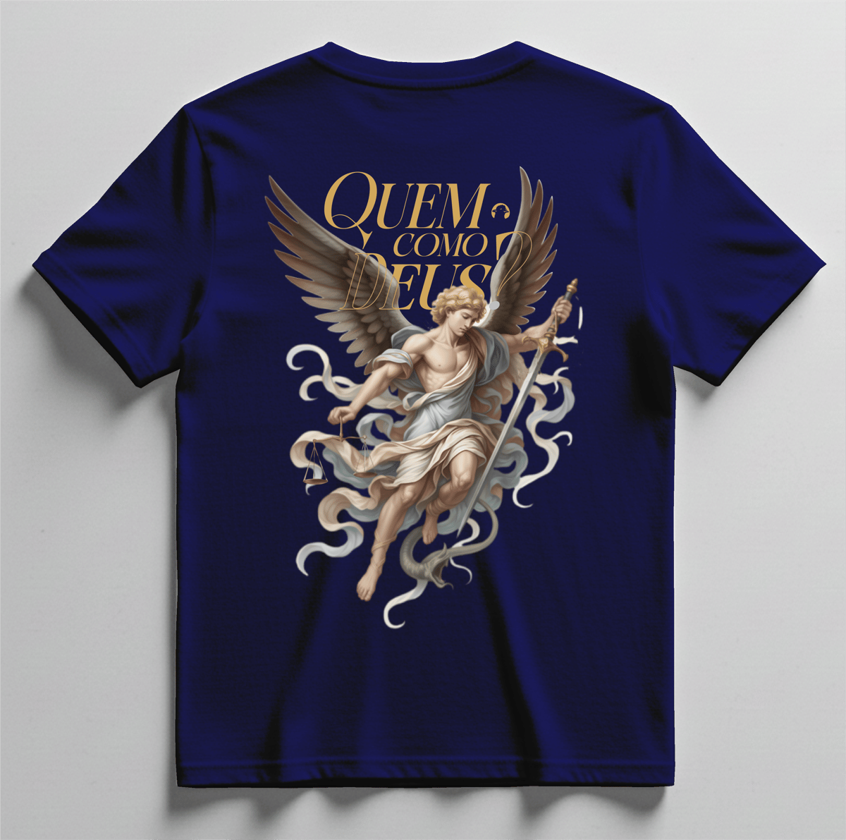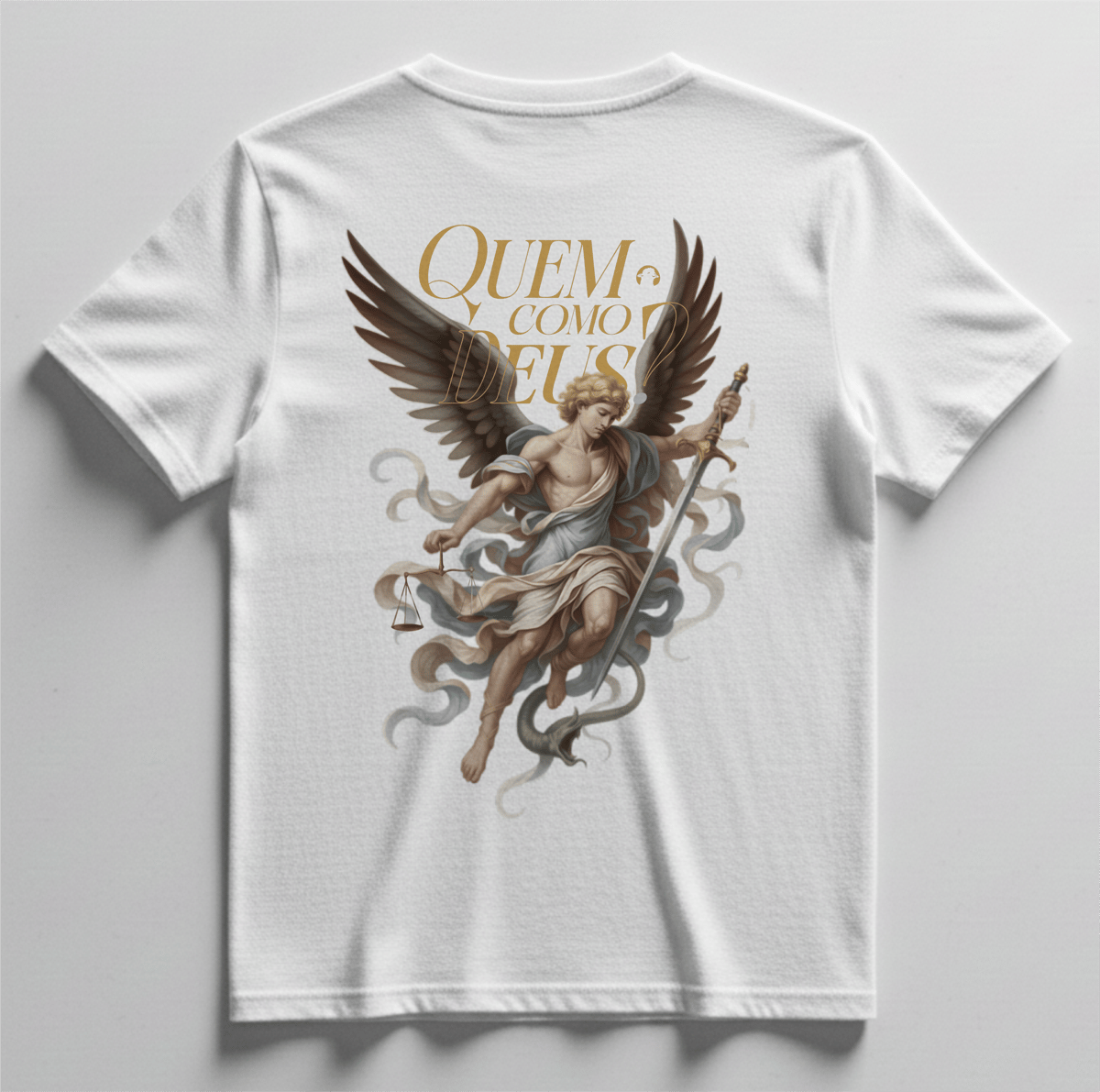 Nas costas, a estampa traz a imagem de São Miguel Arcanjo acompanhada da frase